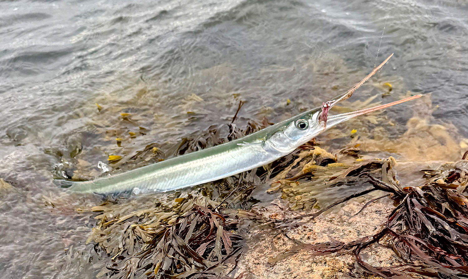 Man gehe gemütlich Angeln und fange sich einen großen dicken Hornhecht!