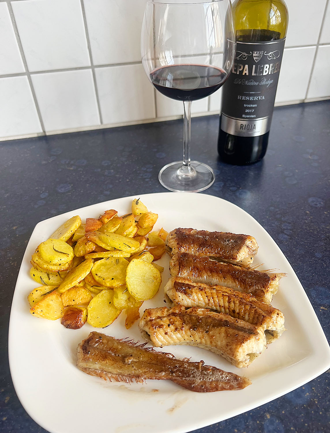 In Butter gebratener Hornhecht mit Rosmarin-Bratkartoffeln und dazu ein Glas Reserva – von Jörg