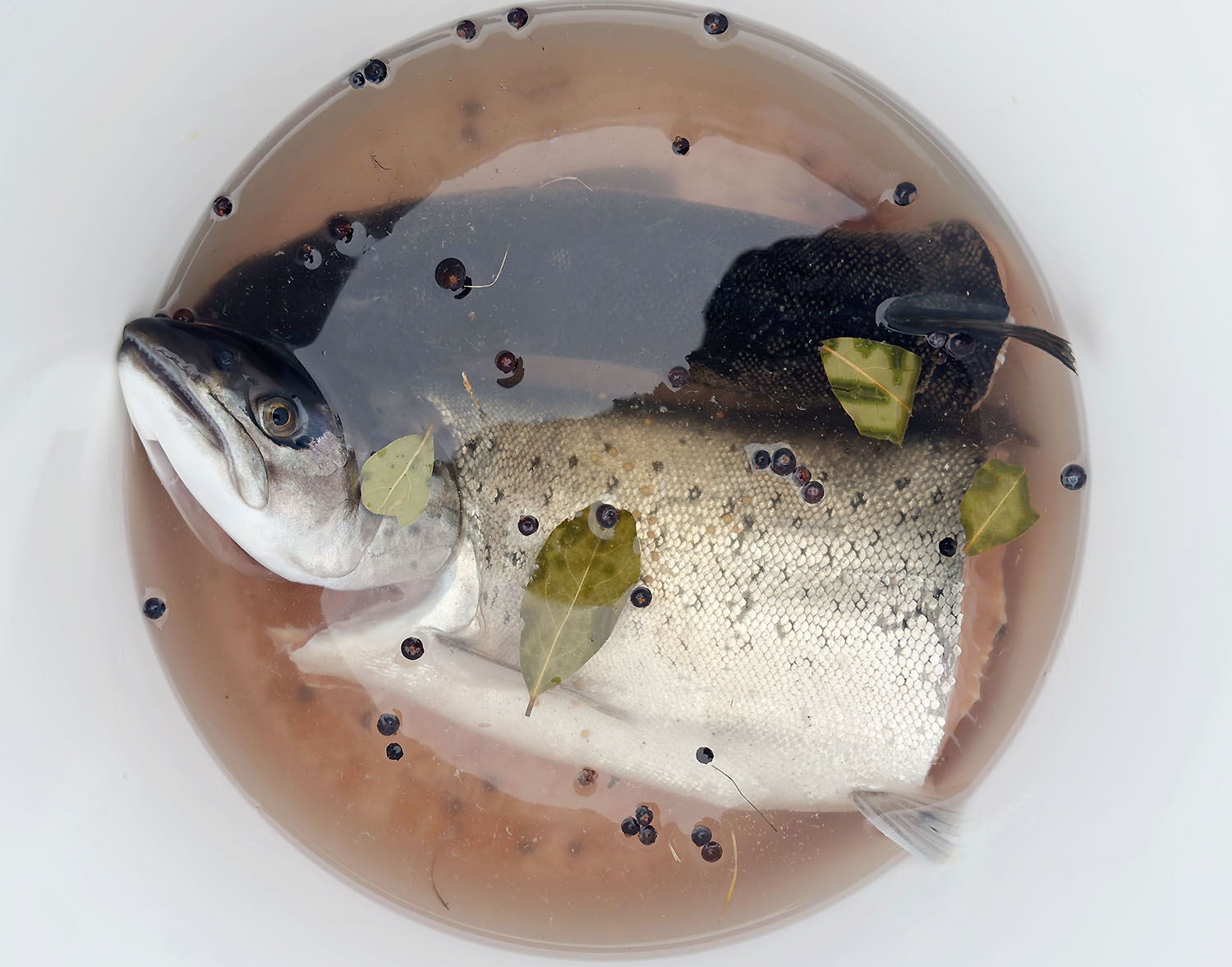 Schritt 1: Die Forellen in Laake einlegen. Dafür braucht Ihr auf 1 Kg Fisch etwa 1 Liter Wasser, 100g Salz, 2 Esslöffel Wacholderbeeren, 2 Esslöffel Senfkörner und etwa 4-6 Lorbeerblätter. Um die Laake so richtig “effektiv”, also lecker zu machen, empfehle ich Euch, soweit möglich, das ganze in einem Liter Wasser, also die Gewürze, kurz aufzukochen. Dann zum restlichen Wasser, je nachdem wieviel Kilo Gewicht Ihr räuchern wollt. Die Flüssigkeit sollte kühl und nicht warm sein, wenn der Fisch dazu kommt. Natürlich die Fisches ordentlich ausgenommen und ohne Kiemen. Auf 4 Kilo Fisch, kämen also zur erhitzten Flüssigkeit noch drei Liter kaltes Wasser hinzu. (Unsere Fische waren recht groß, deshalb haben wir die Schwanzteile gegraved und die Vorderteile geräuchert)