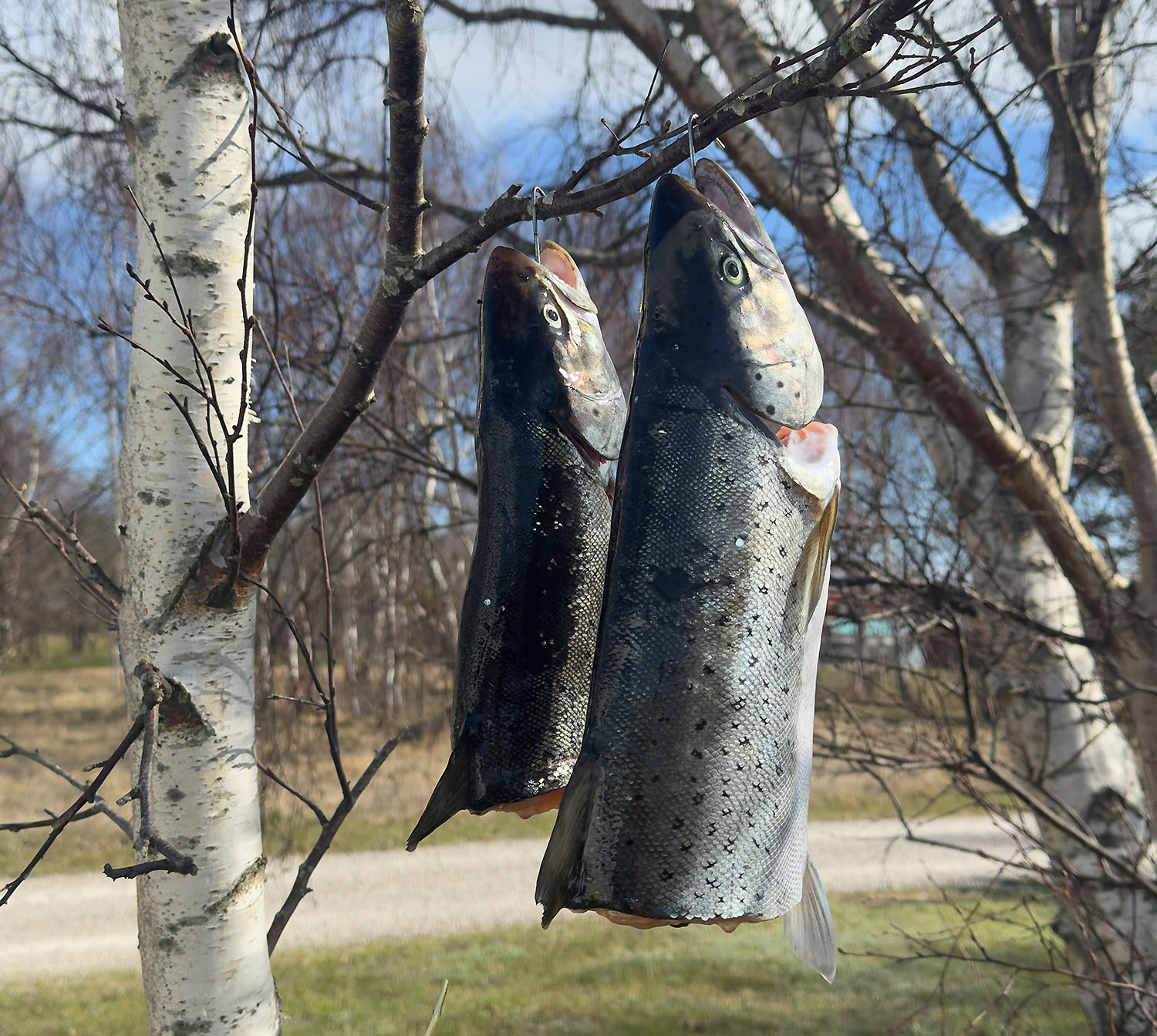 Schritt 3: Lagen die Fische lange genug in der Laake, müssen sie nun ordentlich trocknen. Also raus aus der Brühe und mit Zewa schööön innen und außen abgetupft. Dann am besten die Räucherhaken durch das Maul einfädeln und mindestens zwei Haken in den Wirbelsäulenbereich befestigen. Findert eine schöne windige Stelle, nicht in der prallen Sonne, hier etwa 1 Stunde, je nach Euren Bedingungen, den Fisch an der frischen Luft trocknen lassen.