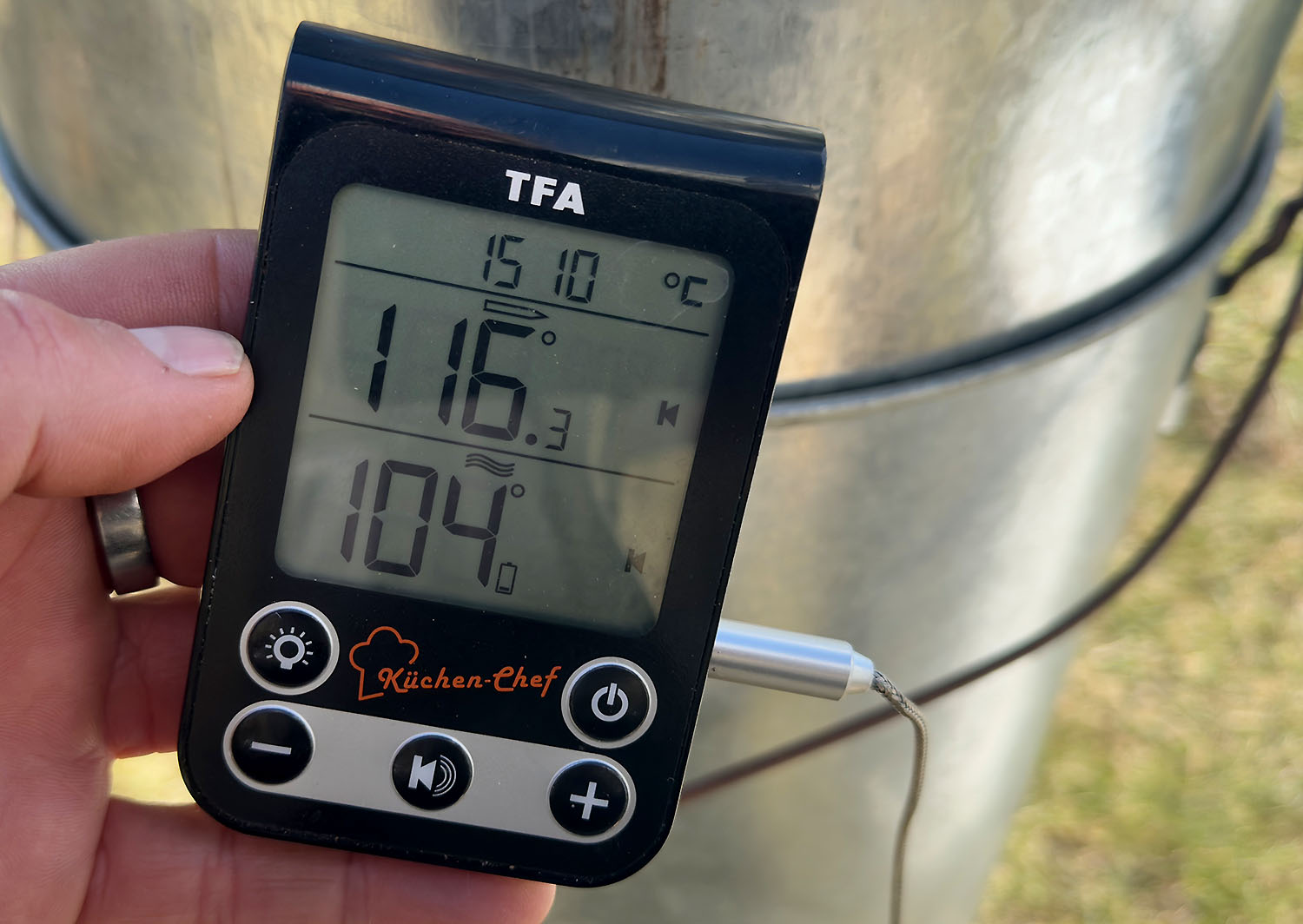 Schritt 5: Nun das heiß ersehnte wirkliche Räuchern. Das Feuer nebst Glut mit dem Buchenmehl ersticken und Deckel komplett zu. Jetzt raucht und riecht es schon zum Anbeißen. Aber noch etwas Geduld. Das eigentliche Räuchern im Buchenrauch sollte mindestens 30- 60 Minuten dauern. Dabei ist es wichtig, die Temperatur durch das Ersticken herunter zu bekommen. Also irgend etwas zwischen 30 und 60 Grad. Ich nutze zum Temperatur messen ein Bratenthermometer mit flexiblen Schlauch, welches ich einfach mit der Messspitze auf Höhe der Fischmitte positioniere und zwischen Ofen und Deckel durchführe.