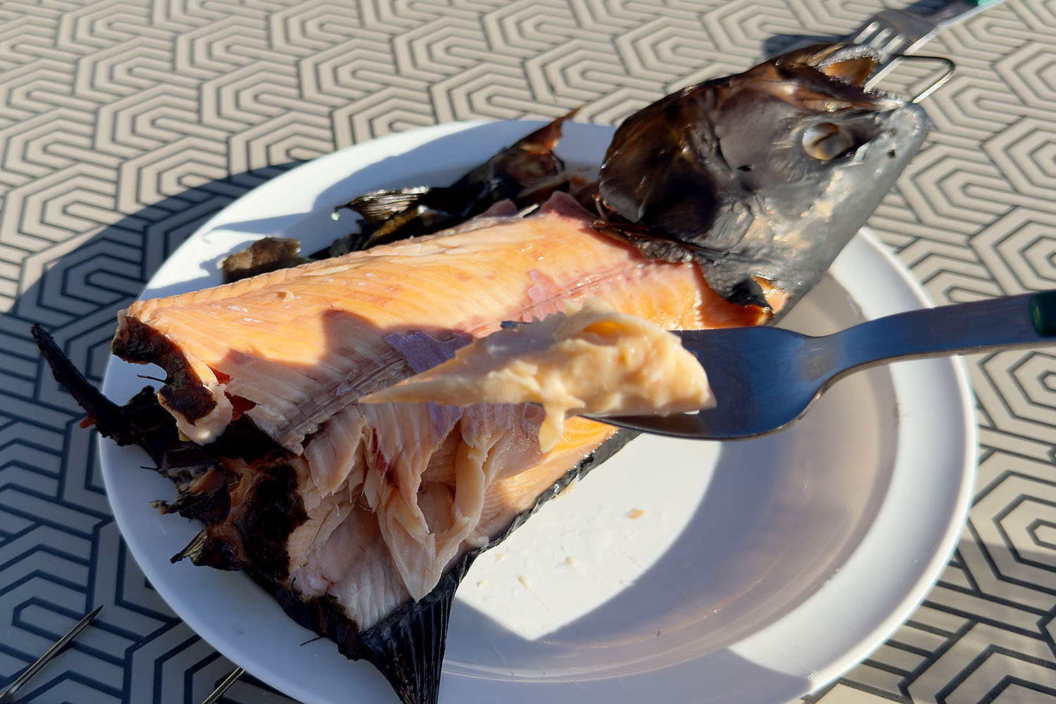Schritt 6: Der Genuss. Habt ihr alles richtig gemacht, sollte die äußere Haut jetzt schön goldbrauch sein. Auf unserem Bild ist die Haut leicht angekokelt, was der wirklichen Dicke des Fisches und damit verbundener längerer Garzeit geschuldet war.