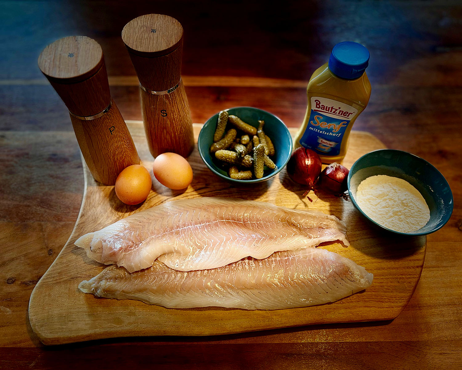 Zuerst die Gurken und die Zwiebel in sehr kleine Würfel schneiden und gut vermischen. Anschließend die Fischfilets etwas mit Salz und Pfeffer würzen und in Mehl wenden. Eine Seite dünn mit Senf bestreichen und anschließend noch einmal in Mehl wenden. Dann in die Gurken-Zwiebel-Panade tauchen und fest andrücken. Anschließen im gequirlten Ei wälzen.